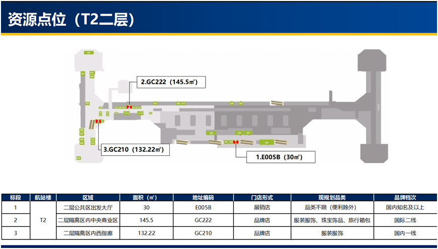 1 | T2 | 二层公共区出发大厅 | 30 | E005B | 品类不限 (便利除外) | 展销店 | 国内知名及以上 |