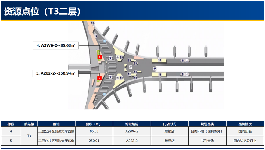 4 | T3 | 二层公共区到达大厅西侧 | 85.63 | A2W6-2 | 品类不限 (便利除外) | 展销店 | 国内知名 |