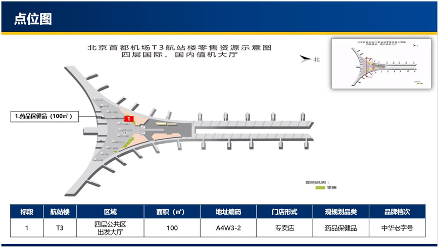 1 | T3 | 四层公共区出发大厅西侧 | 100 | A4W3-2 | 药品保健品 | 专卖店 | 中华老字号 |