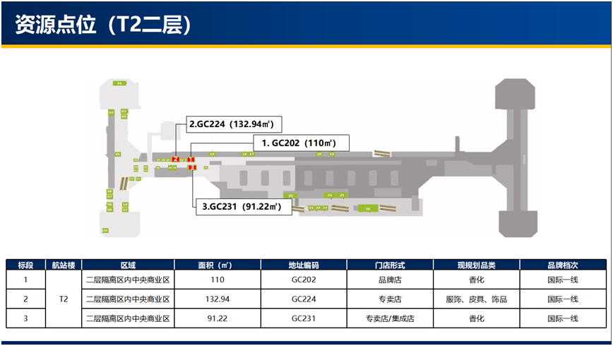 2 | 二层隔离区内中央商业区 | 132.94 | GC224 | 服饰、皮具、饰品 | 专卖店 | 国际一线 |