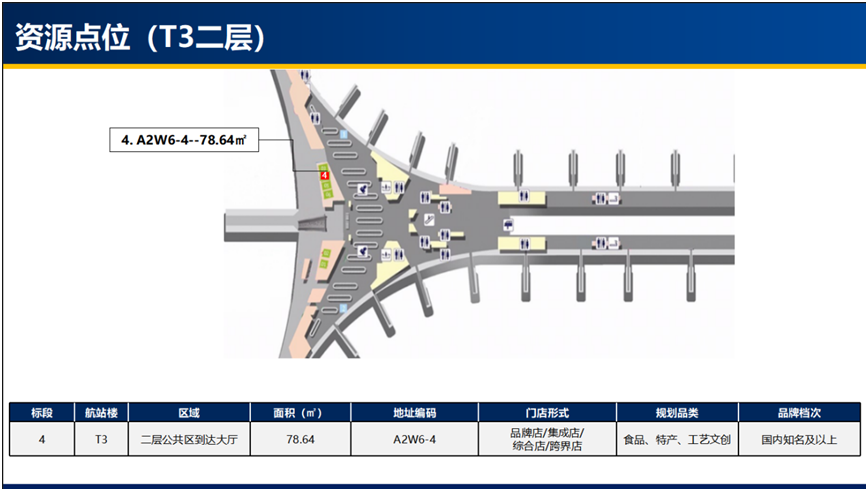4 | T3 | 二层公共区到达大厅 | 78.64 | A2W6-4 | 食品、特产、工艺文创 | 品牌店/集成店/综合店/跨界店 | 国内知名及以上 |