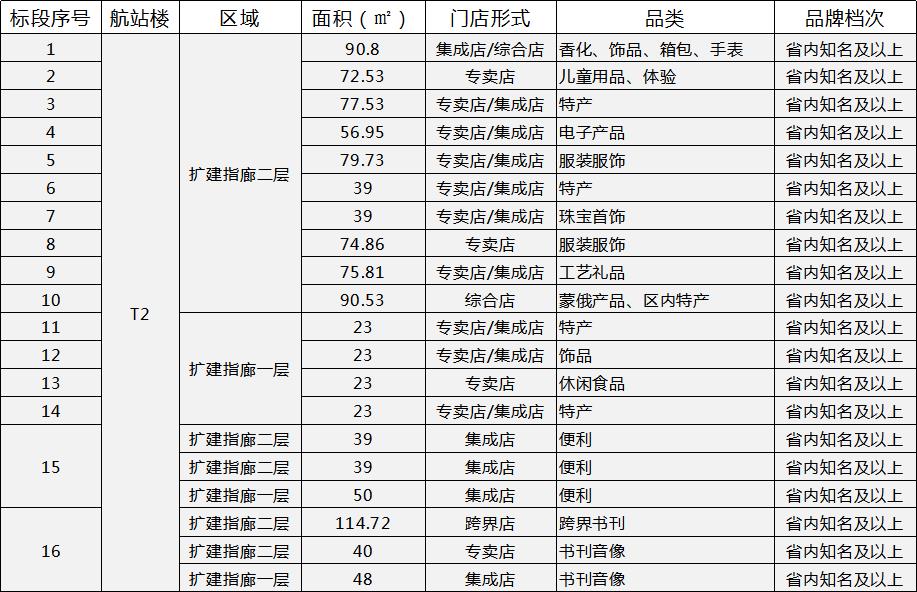 内蒙古呼和浩特白塔机场航站楼部分零售店铺招商信息面向社会公开发布,招商总面积 1119.46㎡,共20个店面(划分为16个标段),位于白塔机场新建指廊,项目涉及香化、饰品、箱包、手表、儿童用品、体验、特产、跨界书刊、电子产品、服装服饰、便利、珠宝首饰、工艺礼品、书刊音像、蒙俄产品、区内特产、饰品、休闲食品、详见下表: